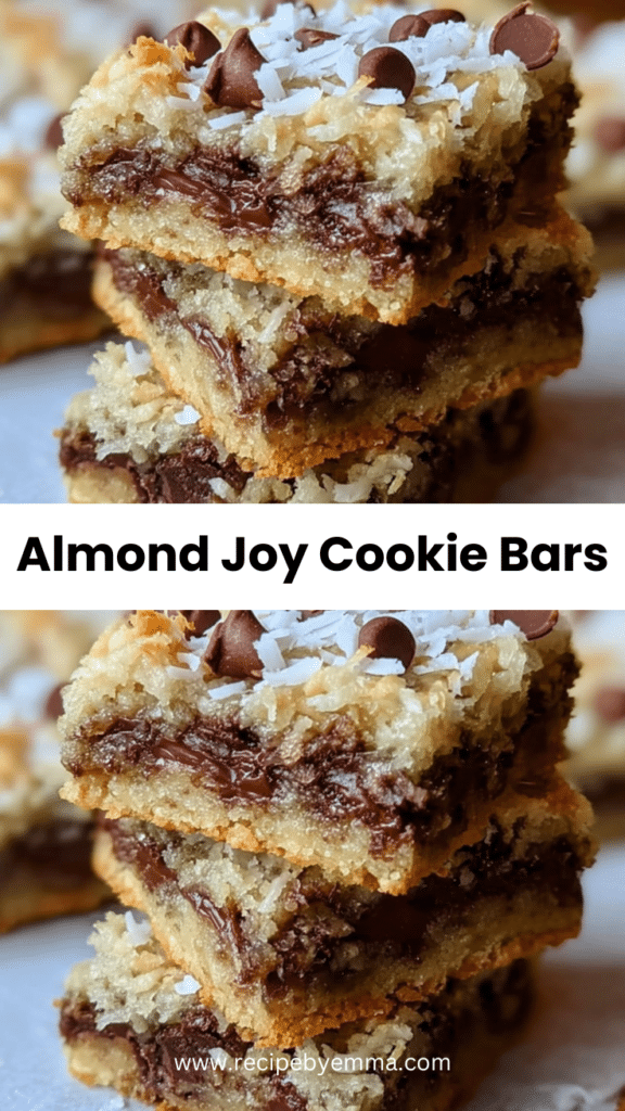 These Almond Joy Cookie Bars are an irresistible layered dessert featuring a buttery cookie base, gooey chocolate chips, crunchy almonds, and sweet shredded coconut – perfect for potlucks, bake sales, or a homemade treat.