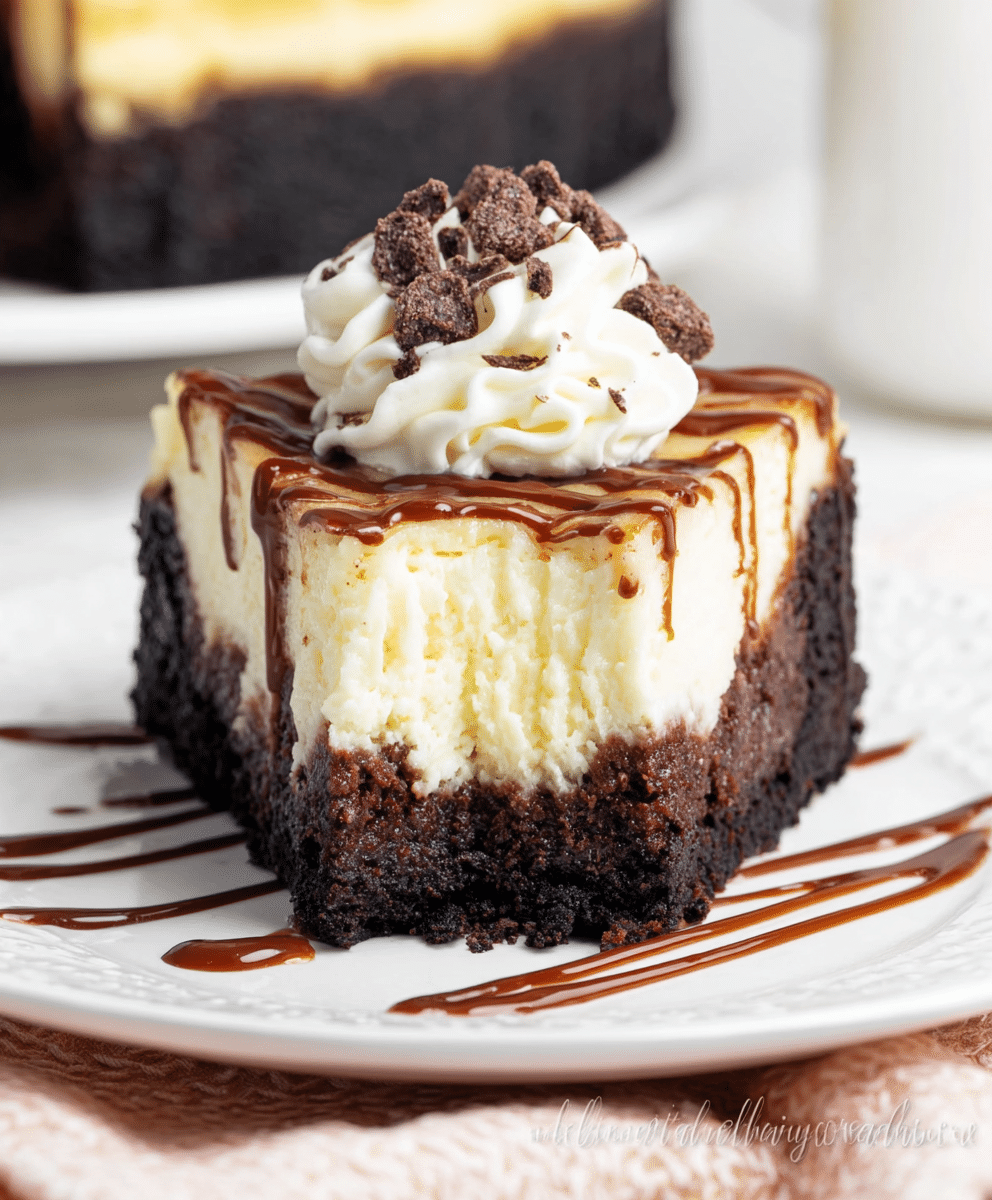 This rich and creamy Brownie Bottom Cheesecake features a fudgy brownie base, silky cheesecake layer, topped with whipped cream and chocolate drizzle for a decadent dessert.