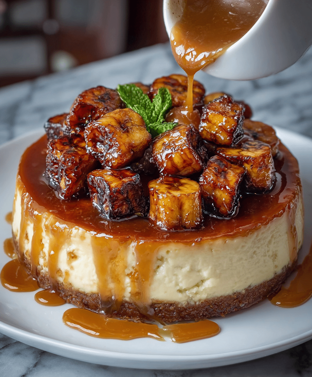 This Caramelized Banana Cheesecake with Rum Glaze is a show-stopping dessert featuring a rich cheesecake base topped with sticky caramelized bananas and a glossy rum glaze. Perfect for impressing guests or indulging in a decadent treat.