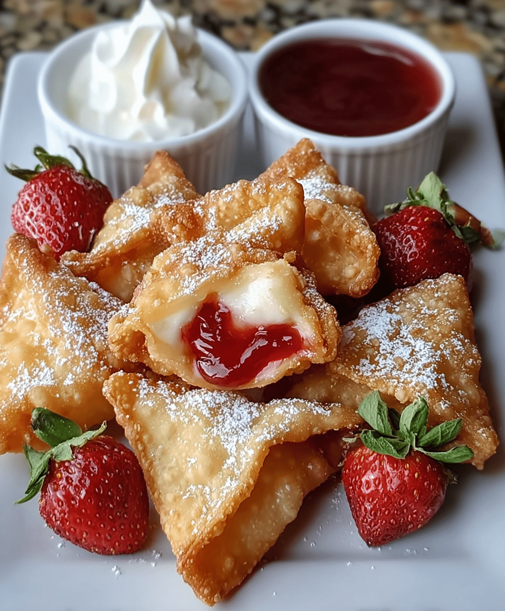 Deep-Fried Strawberry Cheesecake Stuffed Wonton Bites are crispy on the outside and filled with a creamy, strawberry-filled center, perfect for dessert!