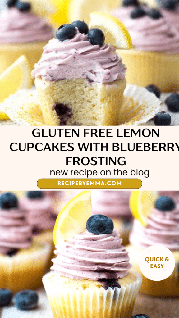 These Gluten-Free Lemon Cupcakes with Blueberry Frosting are soft, fluffy, and naturally brightened with fresh lemon juice and lemon zest, then topped with a creamy blueberry buttercream made from fresh blueberries, butter, and powdered sugar. This easy gluten-free cupcake recipe is perfect for spring gatherings, birthday parties, afternoon tea, or any time you want a fruity homemade dessert. With a light lemon cake base and sweet-tart blueberry frosting, these gluten-free lemon cupcakes deliver a refreshing balance of citrus and berry flavor in every bite. If you’re looking for gluten-free cupcake recipes, lemon dessert ideas, or fruity frosting cupcakes, this recipe is simple, vibrant, and bakery-worthy.