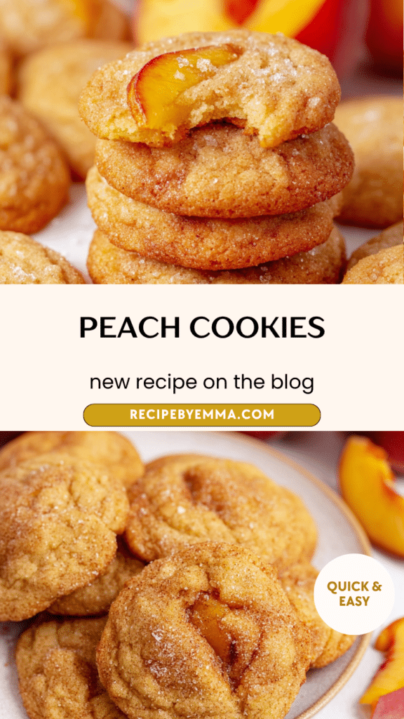 Fresh peaches bring natural juiciness and flavor, while peach preserves deepen the sweetness and enhance the fruitiness in every bite. A touch of cinnamon-sugar on top adds warmth and a slight crunch that balances the soft interior of the cookie.