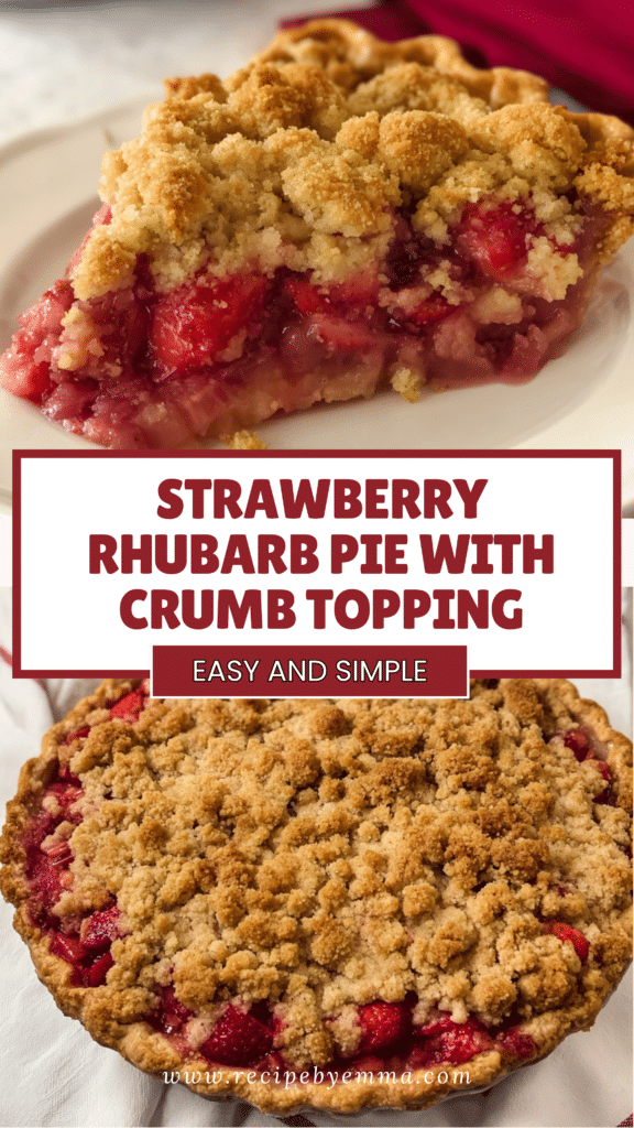 Strawberry Rhubarb Pie with Crumb Topping is a classic dessert with a modern twist. Sweet strawberries and tart rhubarb, combined with a buttery, golden crumb topping, create a delicious balance of flavors and textures. Simple to make yet elegant in presentation, it’s a dessert that will impress guests or delight your family. Save this recipe, share it with friends, and enjoy the comforting, fruity goodness of homemade pie any time of year.