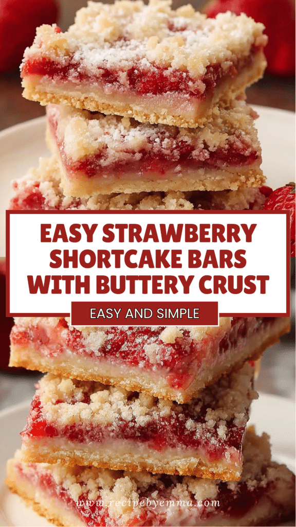 These Strawberry Shortcake Bars are a delightful dessert that combines a tender, buttery shortbread crust, a juicy fresh strawberry layer, and a smooth vanilla glaze, creating a perfect balance of sweetness and freshness in every bite. Ideal for spring and summer gatherings, these bars are easy to make with simple, everyday ingredients, yet they deliver the flavor and appeal of a classic strawberry shortcake in convenient, sliceable bars. The buttery crust provides a slightly crisp base and crumbly topping, while the sweet, soft strawberries peek through between the crumbs. Finished with a delicate vanilla glaze, these bars are visually appealing and irresistibly tasty, perfect for family celebrations, picnics, or potluck desserts. With layers of texture, flavor, and visual appeal, these Strawberry Shortcake Bars are a dessert that will quickly become a seasonal favorite.