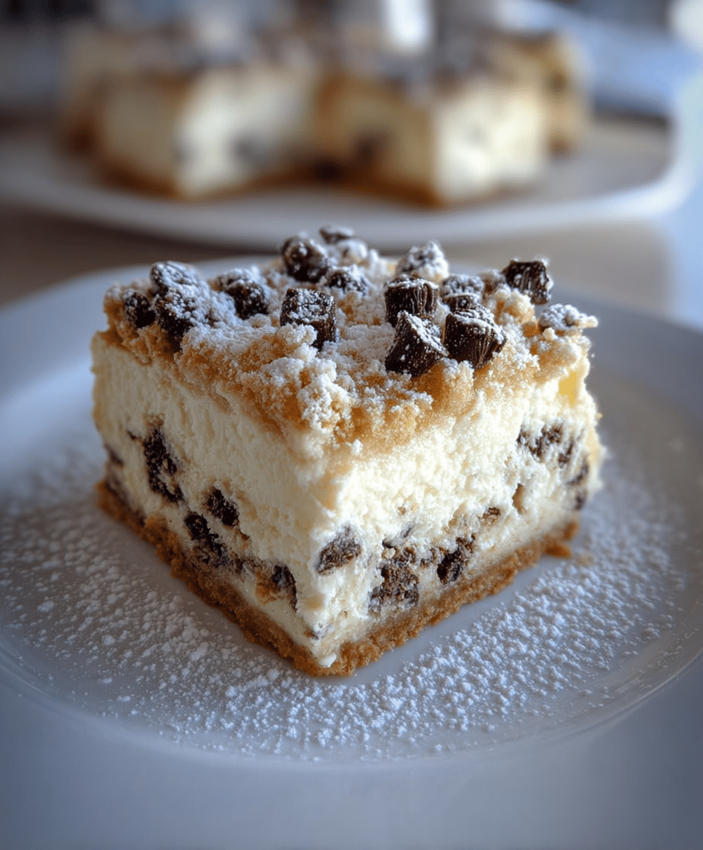 These cannoli cheesecake bars are rich yet balanced. The cream cheese provides structure and indulgence, while ricotta lightens the filling and adds subtle tang. Mini chocolate chips offer bursts of sweetness in every bite, and the graham cracker crust adds buttery crunch. The powdered sugar topping brings a classic cannoli finish without overpowering the dessert.