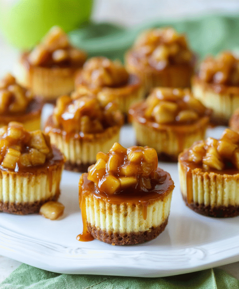 - Make-Ahead: Prepare crusts and cheesecake filling in advance, refrigerate, then assemble apples and caramel just before serving.
