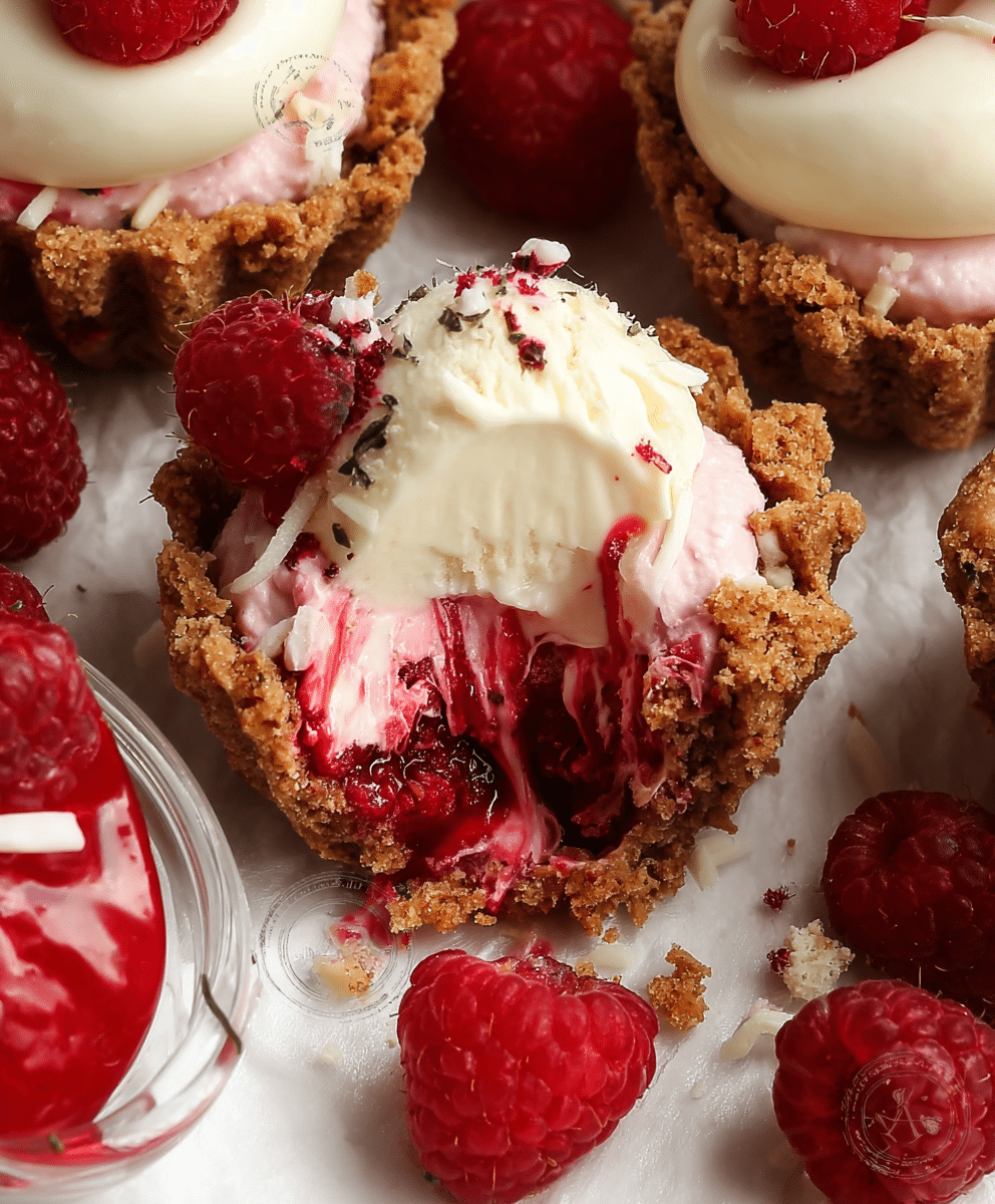 - Raspberry Compote: Mix cornstarch + water. Combine with raspberries, sugar, lemon juice. Cook until thick, cool. Spoon into cookie cups, refrigerate ≥1 hour.