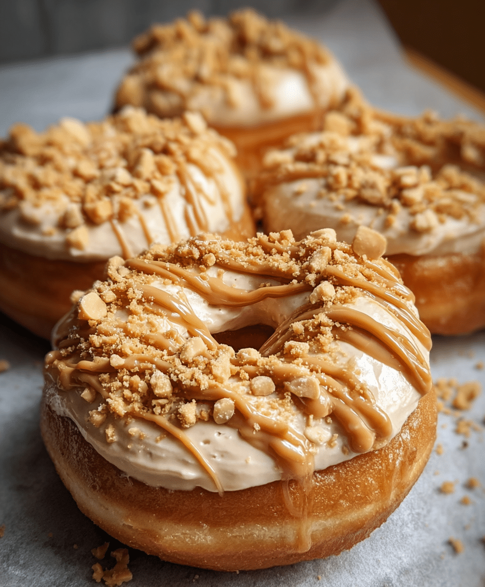 Delicious donuts filled with a creamy peanut butter cheesecake filling, topped with a sweet glaze and optional chopped peanuts. Perfect for dessert or a special treat.