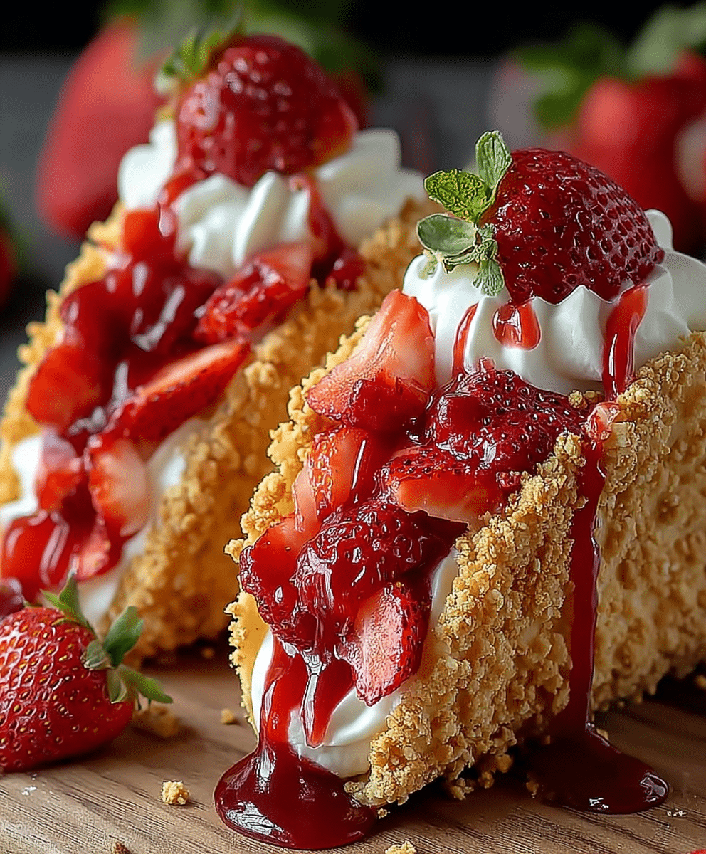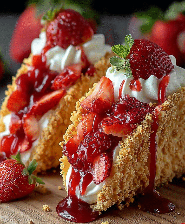 These Strawberry Crunch Cheesecake Tacos are a fun and delicious dessert with creamy cheesecake, crunchy graham cracker shells, and fresh strawberries. Perfect for parties or a sweet treat!
