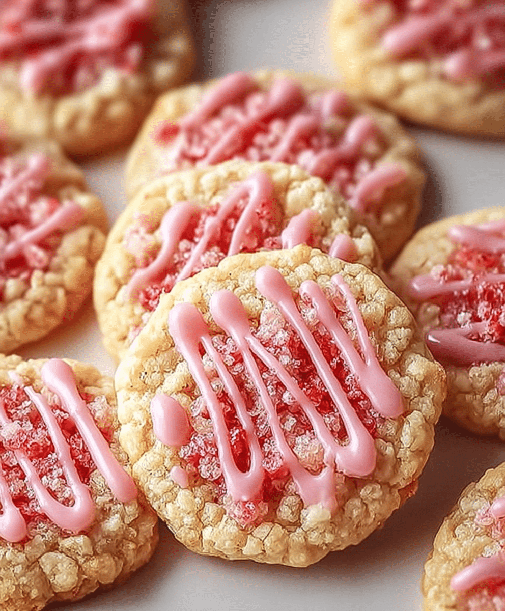 Serve Strawberry Crunch Cookies on a simple platter or stacked on a dessert stand for visual impact. Their pink color makes them ideal for themed events, dessert tables, and gift boxes. For a bakery-style presentation, lightly sprinkle crushed freeze-dried strawberries over the tops before serving.