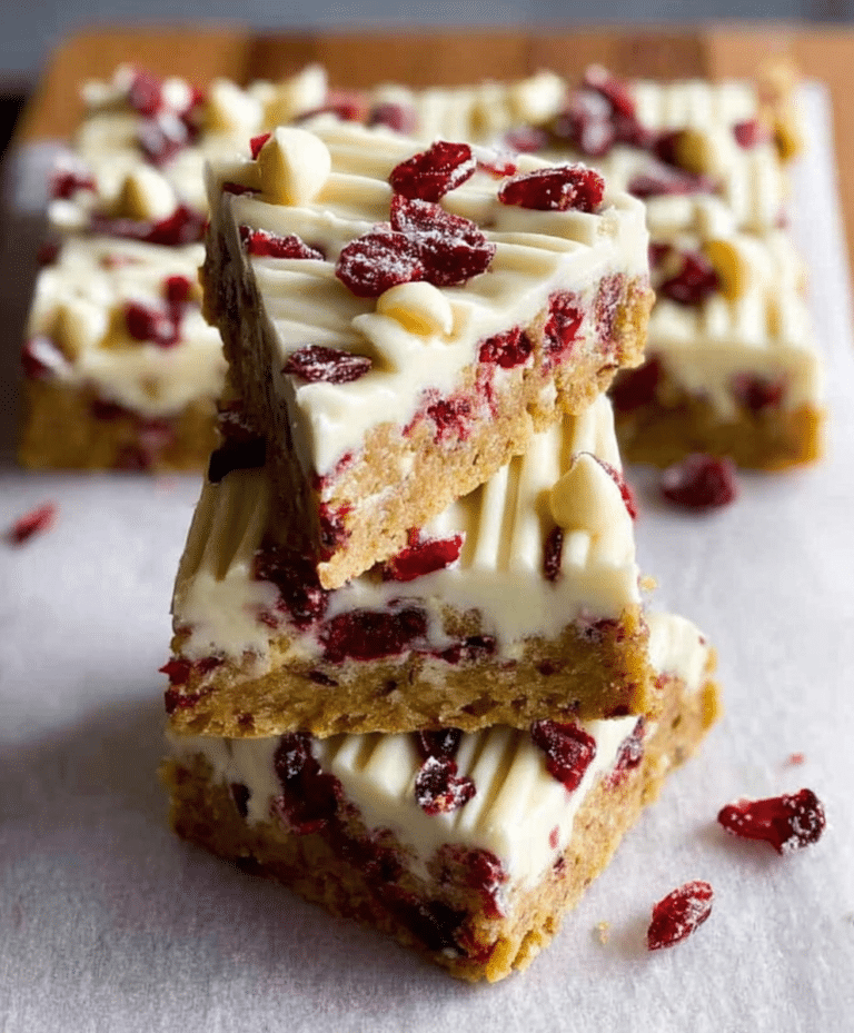 - Fold dry ingredients into wet until just combined. Fold in white chocolate and dried cranberries. Spread batter evenly in prepared pan. Bake 18–22 min until edges golden. Cool to room temperature.