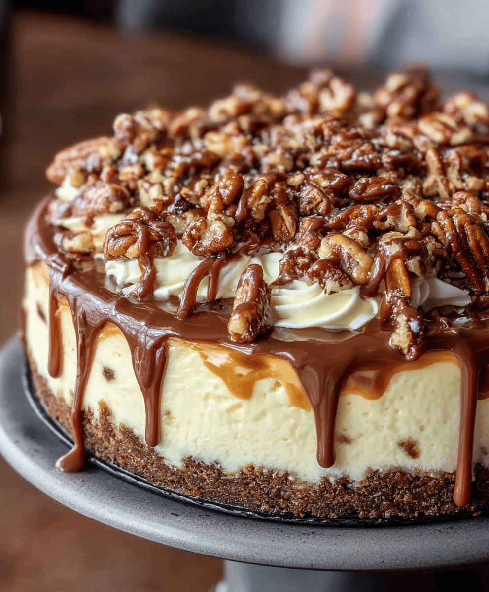 This cheesecake is a dessert masterpiece imagine a fudgy brownie base topped with silky vanilla cheesecake, crunchy pecans, gooey caramel, and ribbons of chocolate ganache. Every bite captures that perfect “turtle candy” flavor chocolate, caramel, and nuts in creamy cheesecake form!