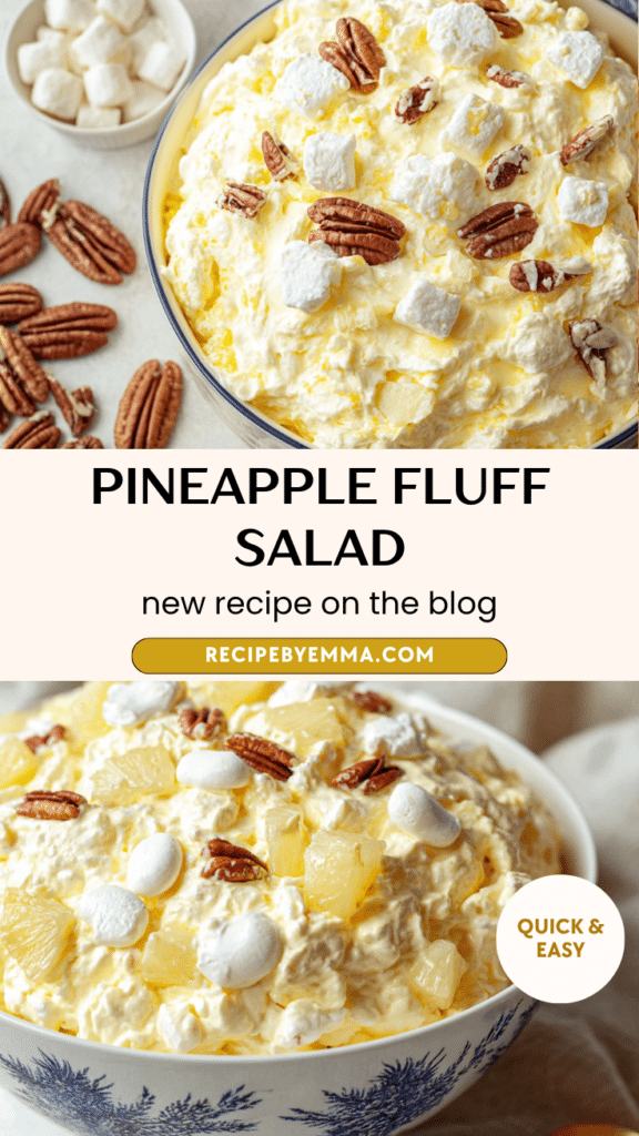 This Pineapple Fluff Salad is a creamy, sweet, and fluffy no-bake dessert salad made with crushed pineapple, instant coconut cream pie pudding mix, sour cream, whipped topping, marshmallows, and pecans. This easy pineapple fluff recipe comes together in just 10 minutes and is perfect for potlucks, holidays, barbecues, and family gatherings. With its light texture, tropical pineapple flavor, and creamy coconut undertones, this pineapple fluff salad is a classic crowd-pleasing dessert that feels both nostalgic and refreshing. If you’re searching for an easy no-bake dessert salad, a creamy pineapple dessert recipe, or a simple party fluff salad, this one is quick, rich, and irresistibly airy.