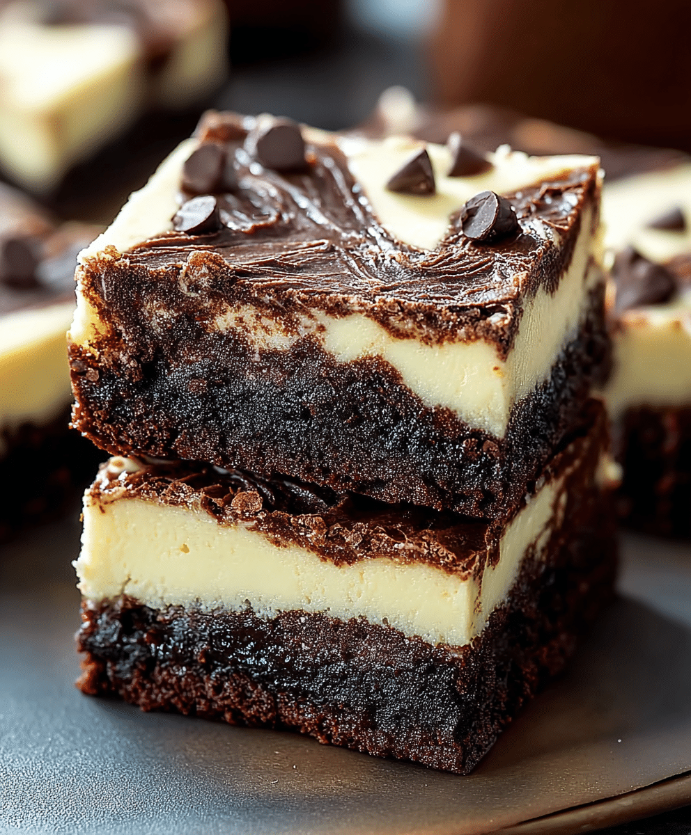 These brownies are rich, fudgy, and deeply chocolatey with a contrasting creamy cheesecake swirl. The texture combines a slightly dense, chocolate base with a smooth, tangy cheesecake layer that melts in your mouth. Optional nuts add crunch, and chocolate chips or peanut butter swirls create bursts of flavor. Each square delivers indulgence with balanced sweetness, making it perfect for dessert lovers.