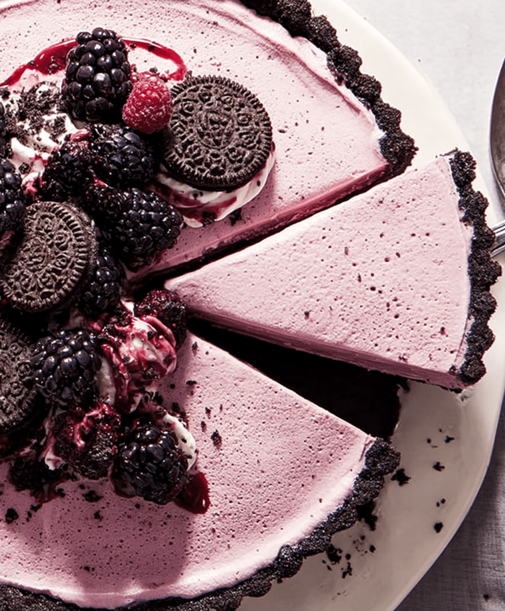 No-Bake Blackberry Oreo Tart is a refreshing summer dessert featuring a crisp Oreo crust, a creamy mascarpone-blackberry filling set with gelatin, and topped with fresh blackberries and optional mini Oreos.