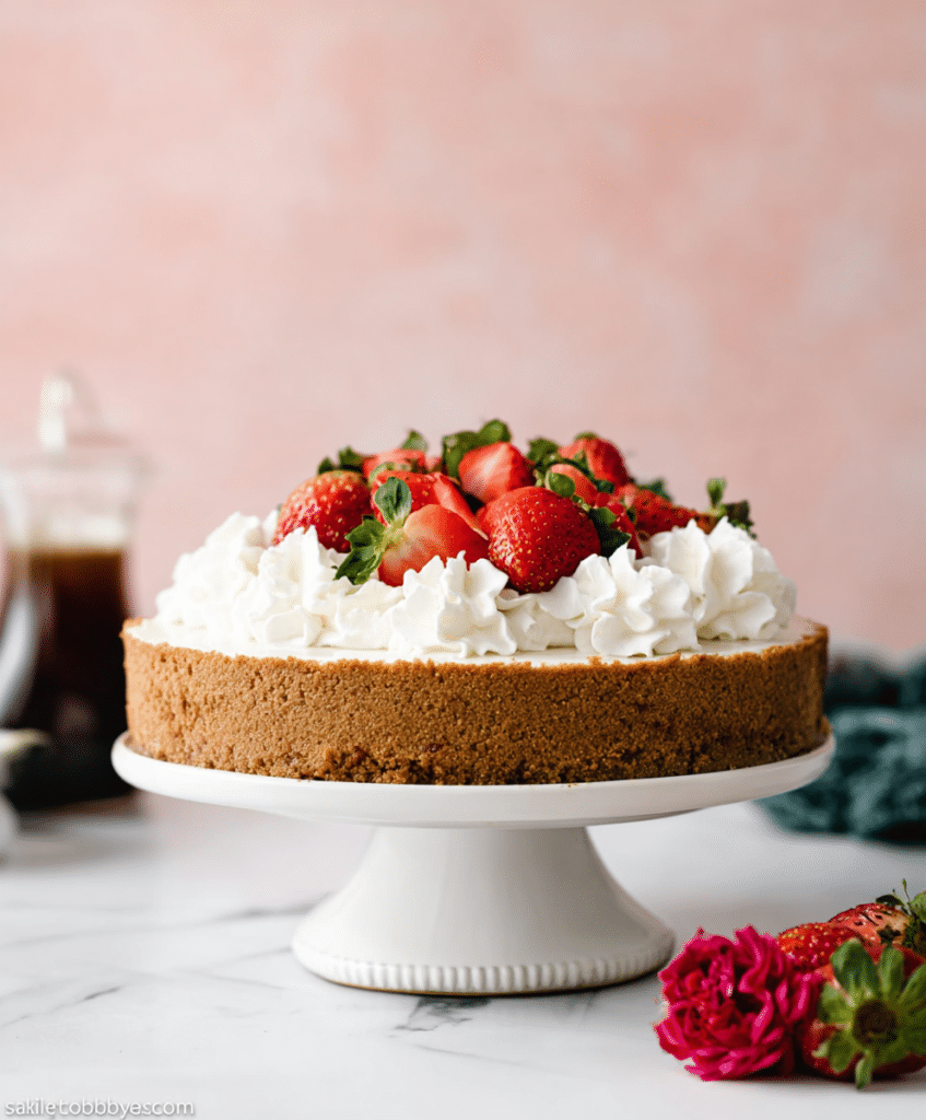 - Top with whipped cream, lemon curd, strawberry sauce, fresh berries, salted caramel, or any favorite cheesecake topping.