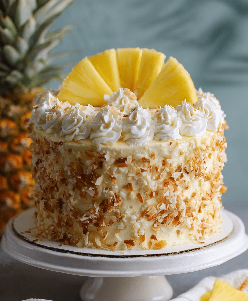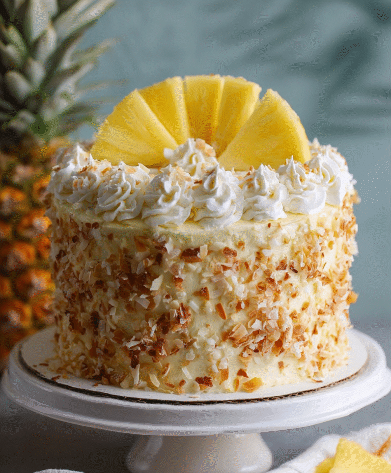 If you’re dreaming of a dessert that transports you straight to a tropical paradise, look no further than this Pineapple Coconut Celebration Cake. Moist, sweet pineapple-infused cake layers meet a luscious coconut frosting, all crowned with a generous topping of toasted coconut. Whether it’s a birthday, anniversary, summer party, or any festive occasion, this cake is guaranteed to impress both in flavor and appearance.